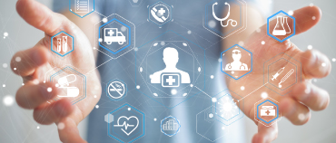 Healthcare provider in scrubs holds web of digitized healthcare images in hands